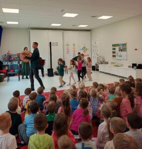 Dzieci z grupy I, IV, V i IX przygotowały z tej okazji krótki, ale bardzo uroczy program artystyczny. Mali artyści z ogromnym zaangażowaniem śpiewali piosenki, recytowali wiersze oraz zaprezentowali krótką inscenizację, w której w zabawny, a zarazem wzruszający sposób pokazali swoją wdzięczność dla nauczycieli i wszystkich pracowników przedszkola.